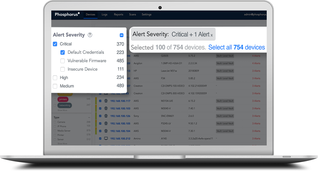 Most xIoT (IoT, OT, and IIoT) devices are shipped with default credentials that are rarely changed, creating an open door for cyber threats, unauthorized access, and regulatory non-compliance. Phosphorus automates IoT/OT credential management and security by proactively rotating credentials to mitigate risk, protect critical infrastructure, and ensure compliance with industry regulations.