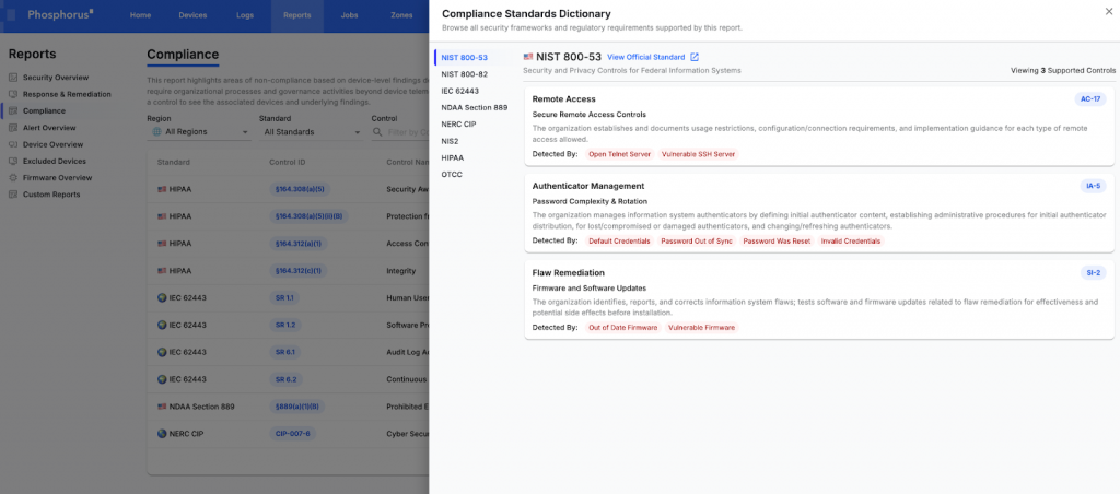 The Compliance Report is built on the premise that regulatory controls are enforced, or violated, by specific device-level conditions. Firmware versions, credential states, configurations, exposed services, and vendor attributes are the mechanisms through which compliance succeeds or fails.